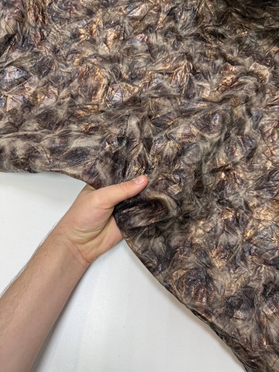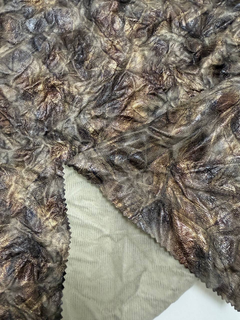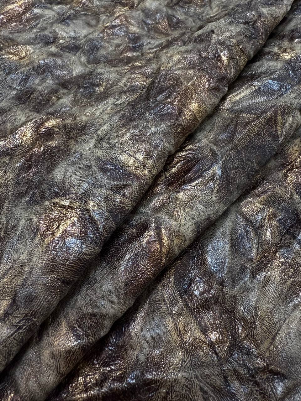 This is a high-quality faux leather that perfectly balances style and comfort. Its soft, tactile surface makes it easy to work with, while ensuring that finished products are comfortable and user-friendly. The crinkled texture adds a dynamic effect, bringing depth and visual interest, while the bronze sheen lends an elegant touch and a subtle metallic glow. Ideal for creating accessories, clothing, footwear, or decorative elements, this material brings a hint of luxury and a modern edge to any design.