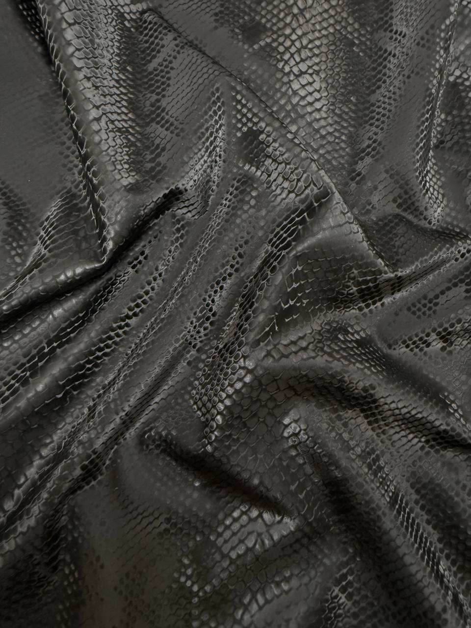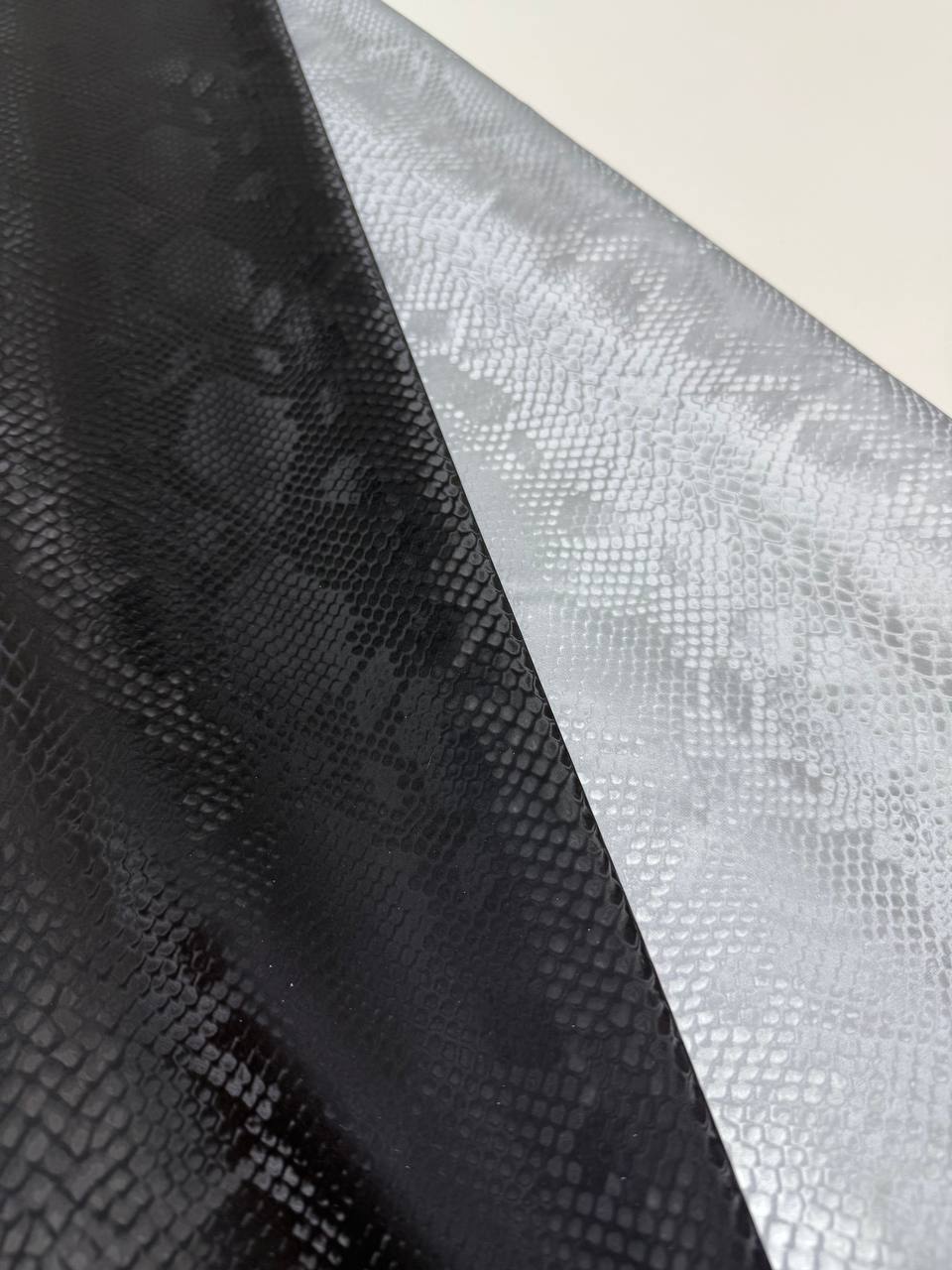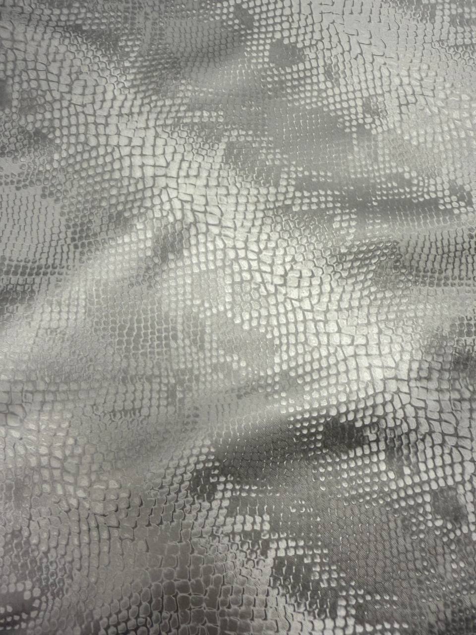It is a high quality material that perfectly combines style and comfort. This soft and supple material has breathable properties, making it ideal for creating garments, accessories and furnishings. The shimmering steel shine of the PU application gives the fabric a unique visual effect, while the noble snake print in black and silver adds sophistication.
