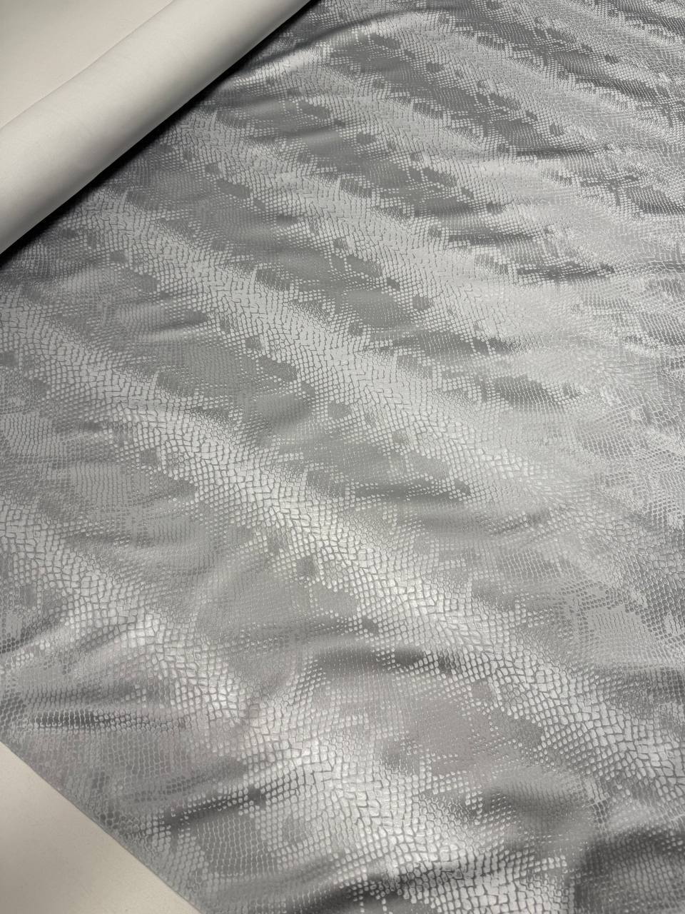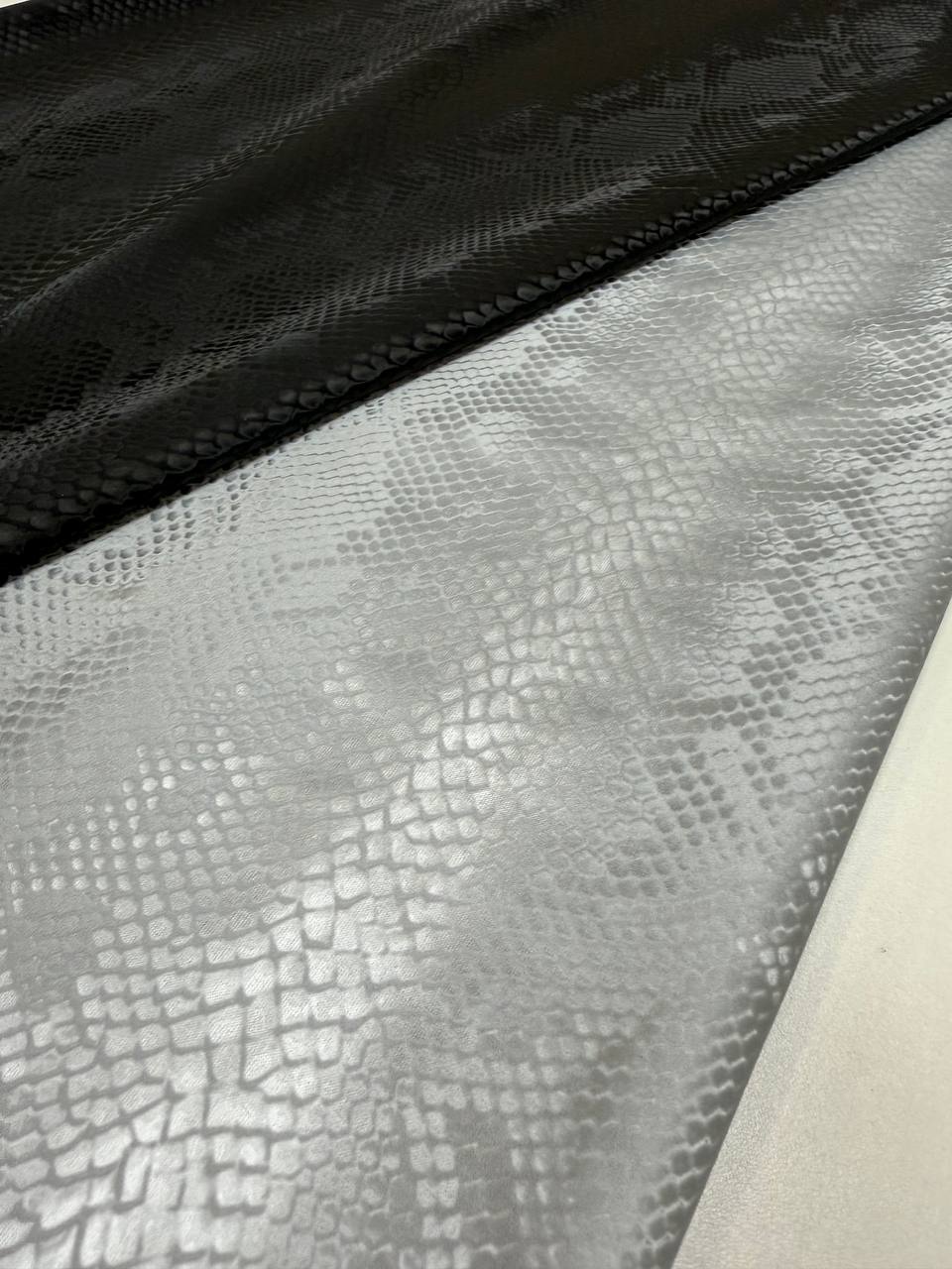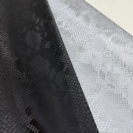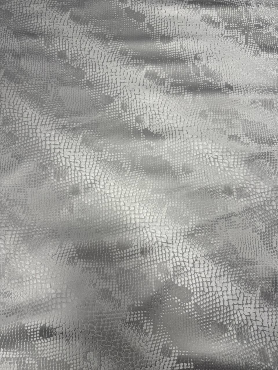 It is a high quality material that perfectly combines style and comfort. This soft and supple material has breathable properties, making it ideal for creating garments, accessories and furnishings. The shimmering steel shine of the PU application gives the fabric a unique visual effect, while the noble snake print in black and silver adds sophistication.