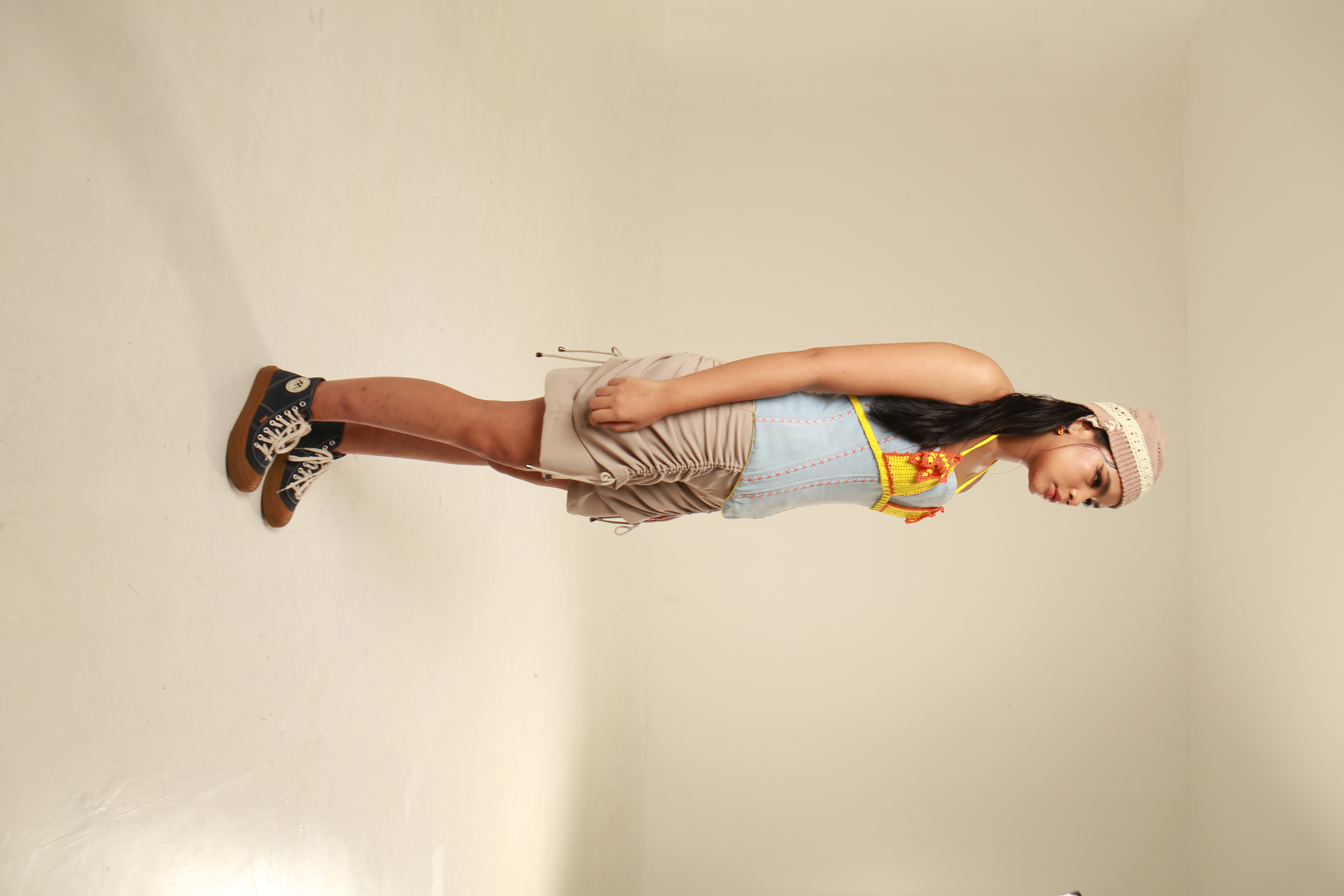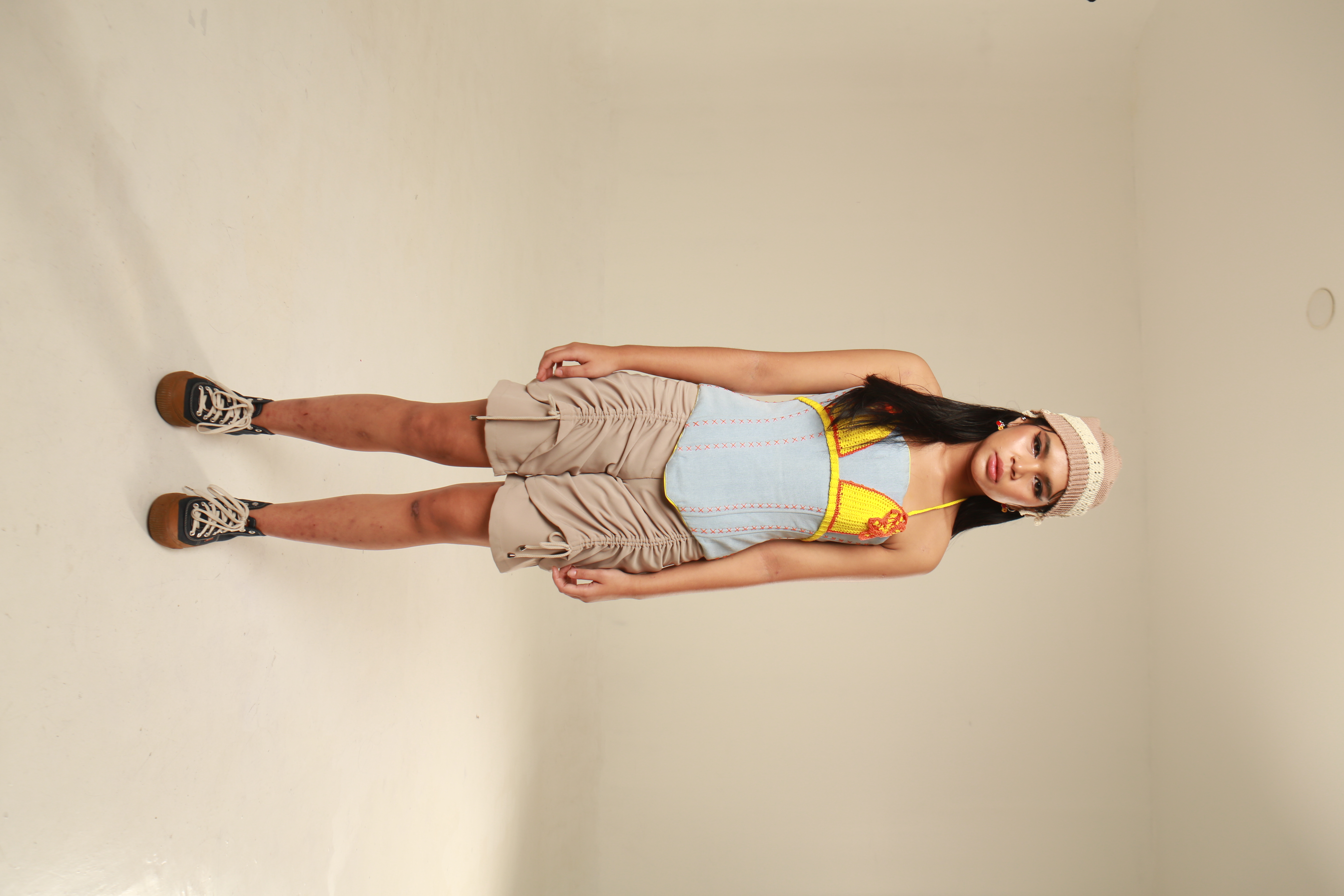 FELITA DELFINA FONG01SS/CC/MDP01Mid-waist double layer Bermuda trousers. Front layer could be adjusted using built-in tie. Front zip fly and metal hook & eye fastening.
