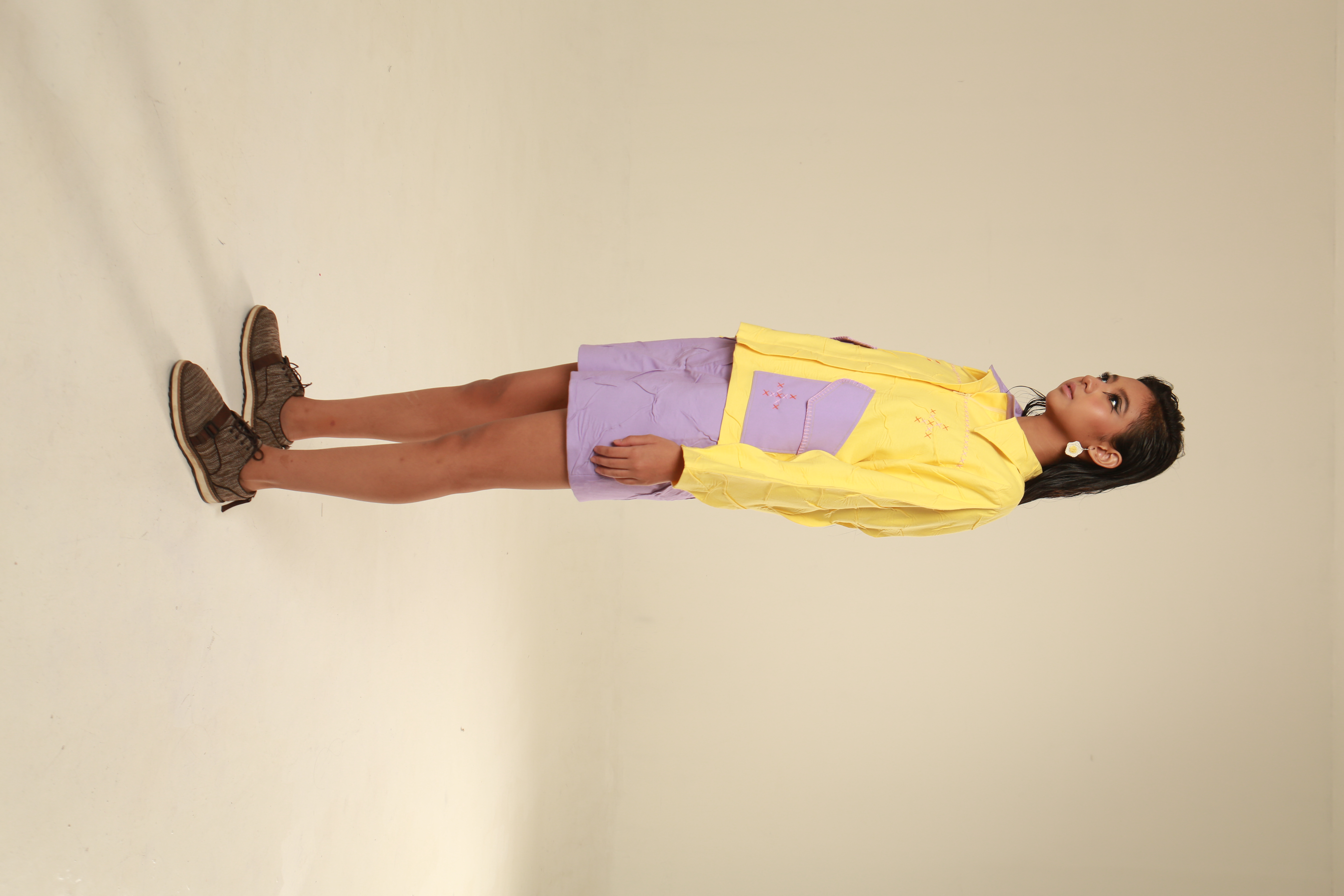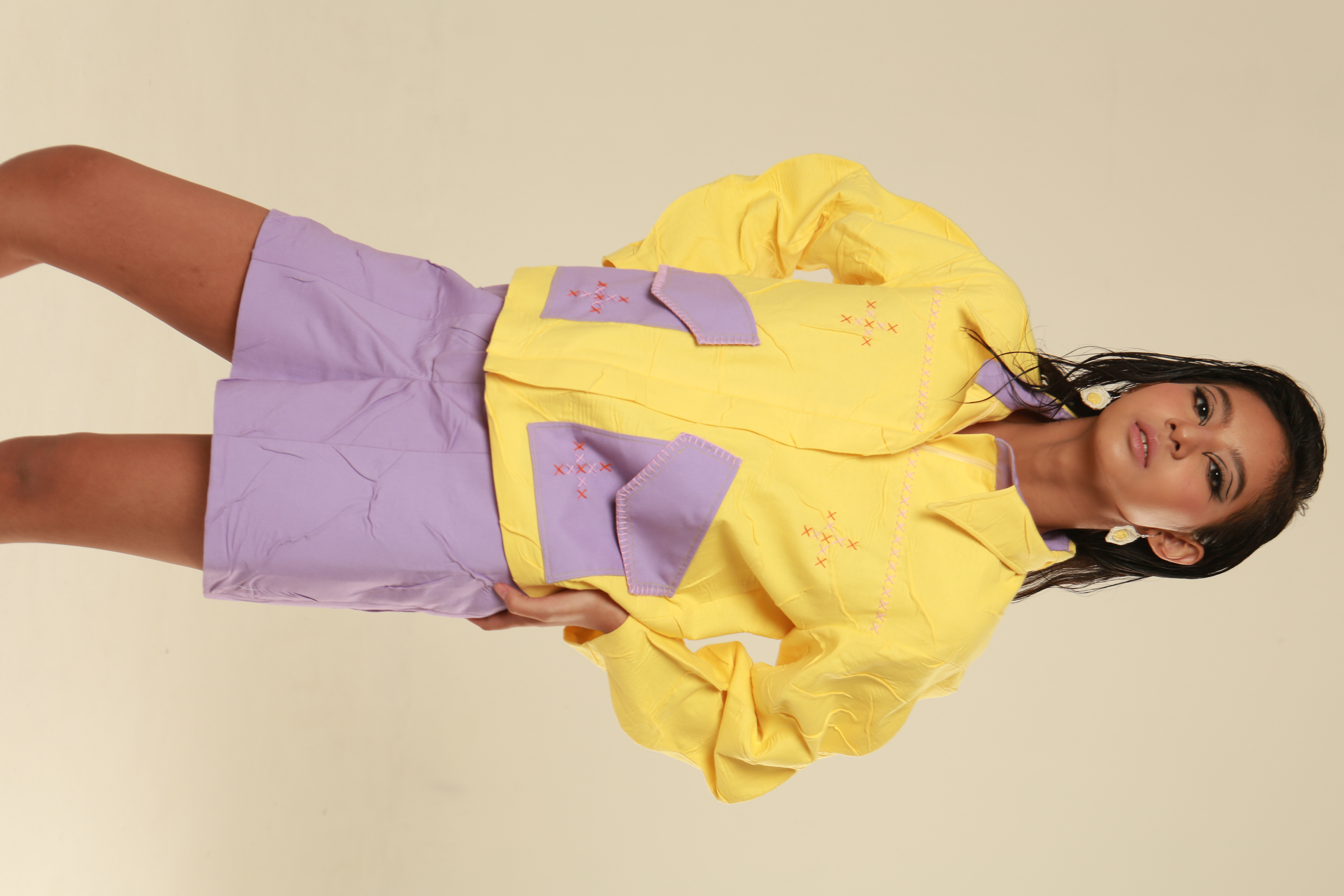 pockets. Yoke detail on the front and back with placket zipper front opening. Textured fabrication and fully lined. Detailed with visible cross-stitching