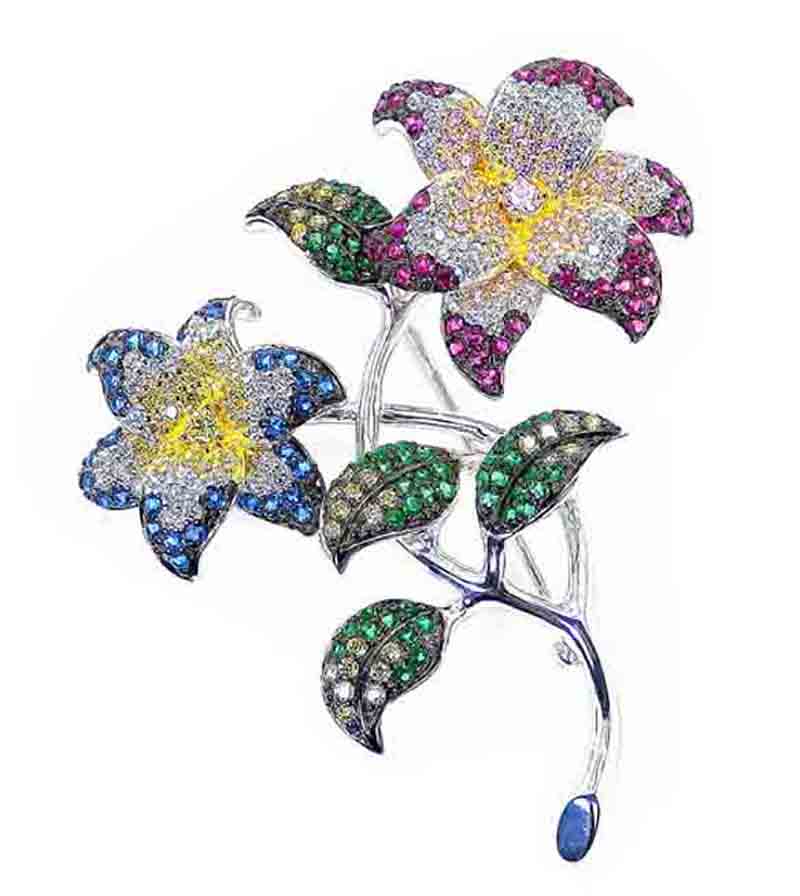 Like wearing a bouquet of fresh flower from your garden. This fine paved flower brooch adds vivid color of to your style and expresses your love of the nature in the spring/summer seasons.