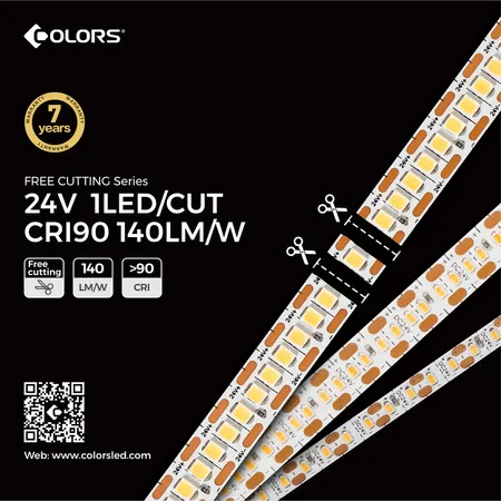 FREE CUTTING series, 2-in-1 design, reduces stock quantity by at least 50%, integrated free-cutting, and high regular efficiency led strips. Due to the customized 24v led chips, it is of free cutting with CRI90 and up to 140lm/W. More important, the 5/8/10mm strips can be connected freely with soldering-free connectors, and also have soldering-free profiles for cabinet lighting.