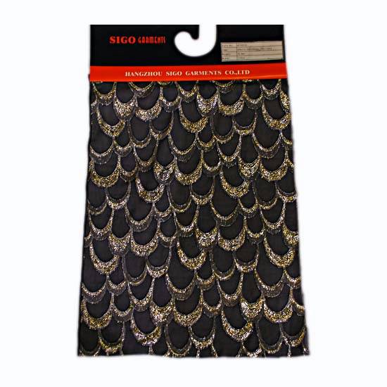 This fabric flaunts unique patterns with shiny sequins. It boasts a soft texture and is comfortable to touch. This fabric is ideal for making various garments such as dresses, blouses, coats and scarves.
