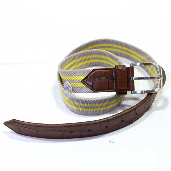 Add style to your wardrobe with this unique fabric belt. Yellow stripes on contrasting grey color create a youthful and refreshing appeal. The head and tail parts are crafted with crocodile skin patterned leather. The fashion accessory goes great with denim.