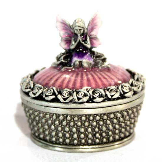 This graceful jewelry box is characterized by a little fairy with pink wings and in a purple dress praying on the cover of the box. The cover is pink in color, rounding with finely crafted metal roses. With round ornaments covering the body of the box, the jewelry box looks more stunning. Keep your precious jewelry in this beautiful box.