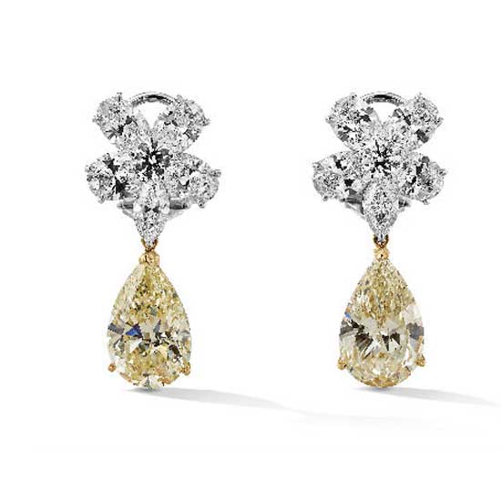 Displayed is a pair of fancy color diamond earrings that comes in a dangle style. With large pear-shaped yellow diamond dangles, these earrings are mounted on gold. These sparkling and gorgeous earrings are great for cocktail parties.