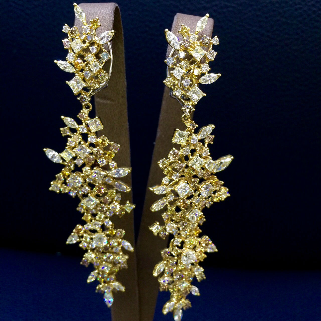 • 18K yellow gold fancy color diamond earrings. Fancy color diamonds, carat total weight 15.09ct.