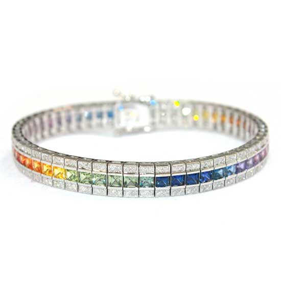 Pictured is a bracelet offering eye-pleasing colors and an ever-popular style. The bracelet is made with various fancy diamonds, rubies, sapphires and fancy sapphires. This dainty bracelet complements any style with ease.
