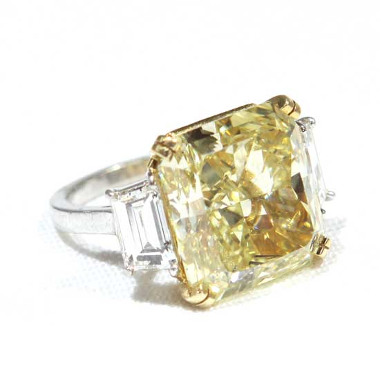 This gorgeously stunning diamond ring will surely make a bold statement to your evening wear. Embellished with a 23.20 fancy yellow diamond, it steals the spotlight from the crowd. This fancy yellow diamond ring catches lady’s attention easily.