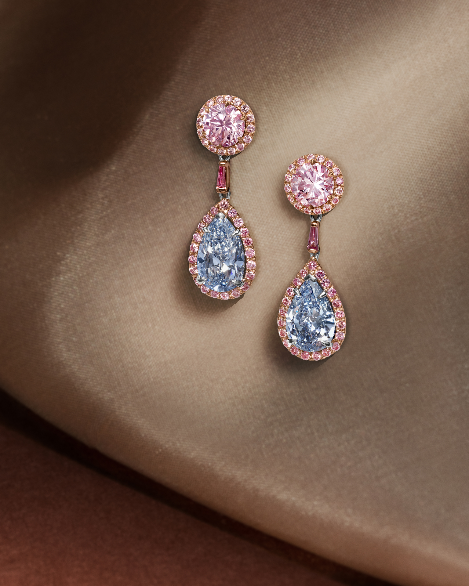 Treasure it: 3.70ct Fancy Intense Blue VVS1/VS2 pear-shaped diamonds with round pink diamonds. Pink diamond studs are detachable.