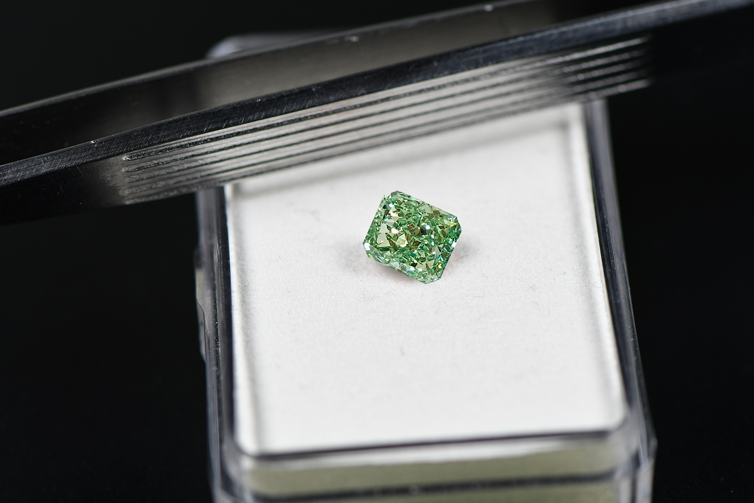 Highlighted is a carat-sized diamond boasting a fancy intense green color. The diamond comes with premium qualities in clarity, color and carat size. The delicate radiant cut makes this diamond a perfect choice for high-end jewelry making.