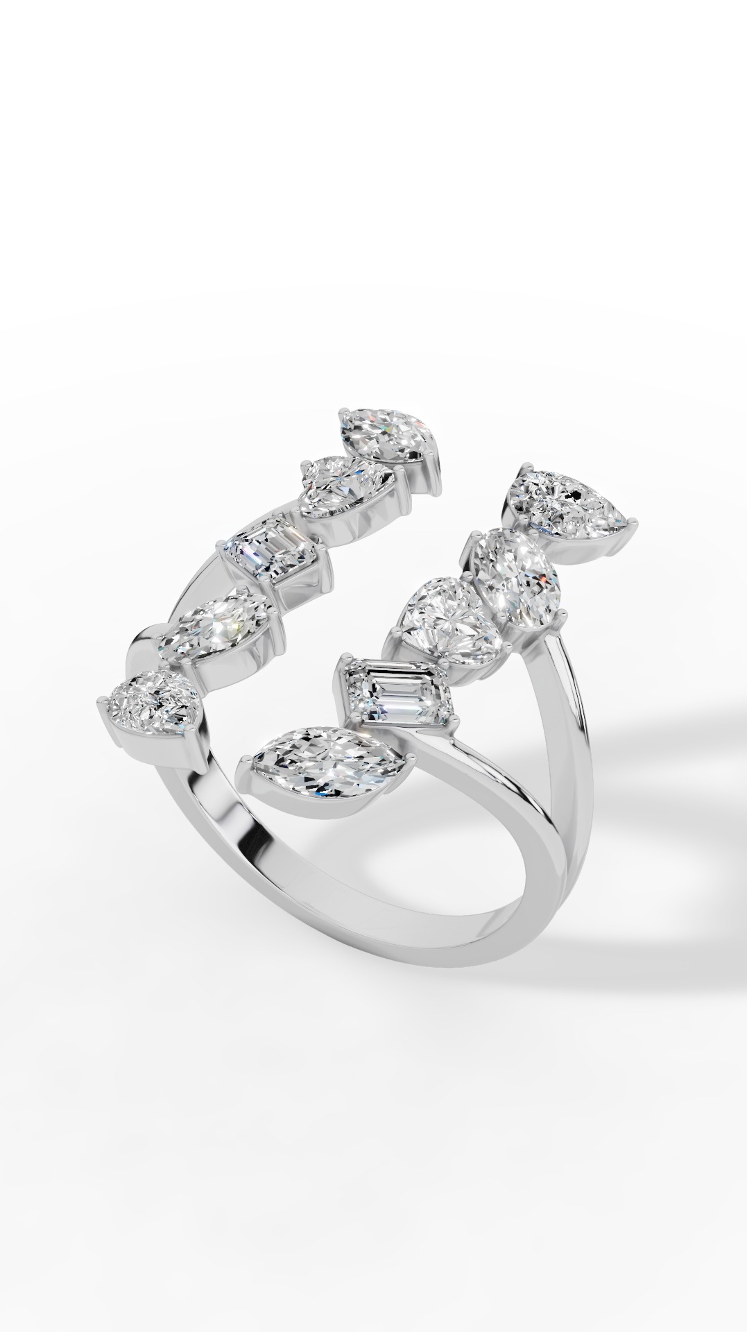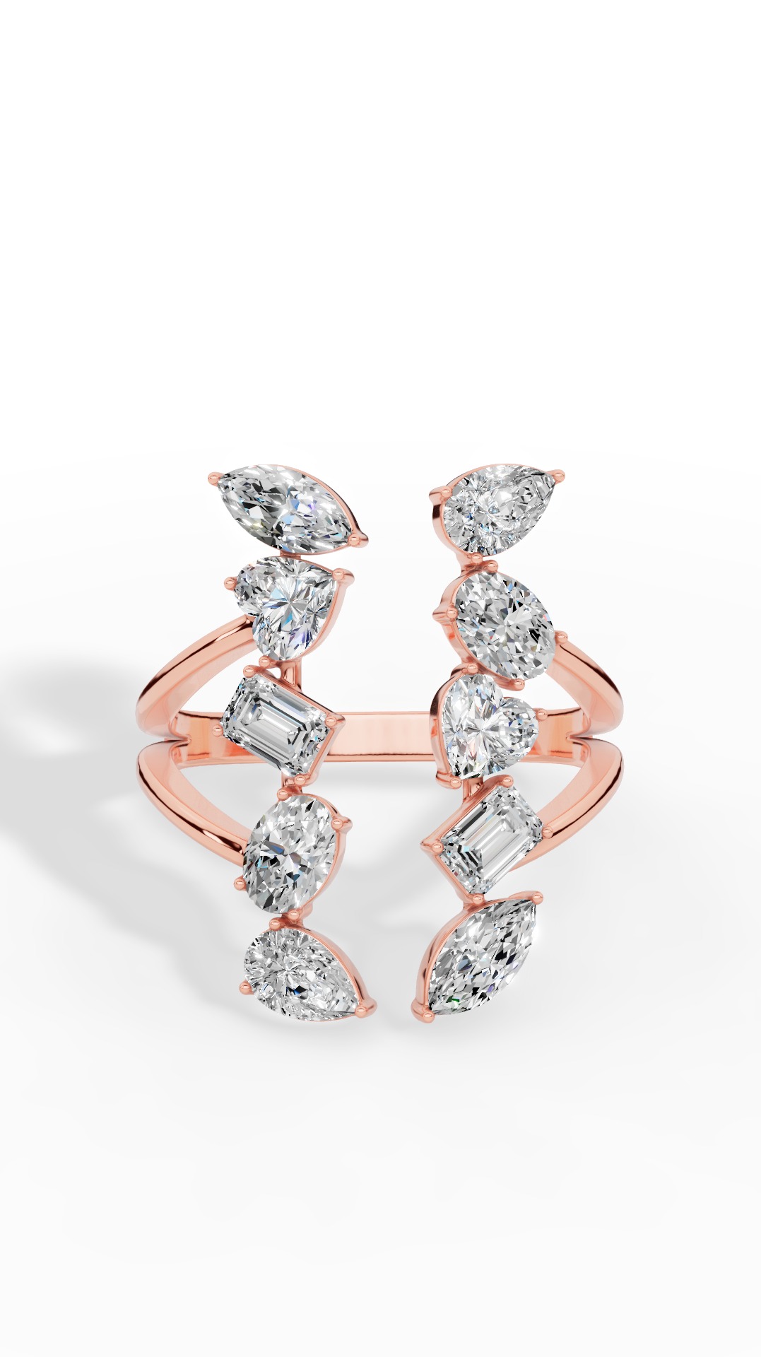 Discover the epitome of modern elegance with this exquisite diamond ring, meticulously crafted to capture light and attention in every moment. Featuring an artful arrangement of multiple diamond shapes including the brilliance of round, the glowing heart, the sophistication of emerald, the excellence of oval and the allure of marquise and pear cuts each gem is carefully set to create a harmonious yet striking silhouette designed to make a statement.