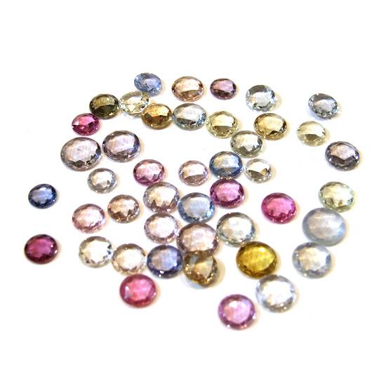 These are loose fancy sapphires in a wide range of colours, such as pink, blue, green and yellow. They are all oval in shape with rose cut but are different in sizes, which gives a variety in jewellery making.