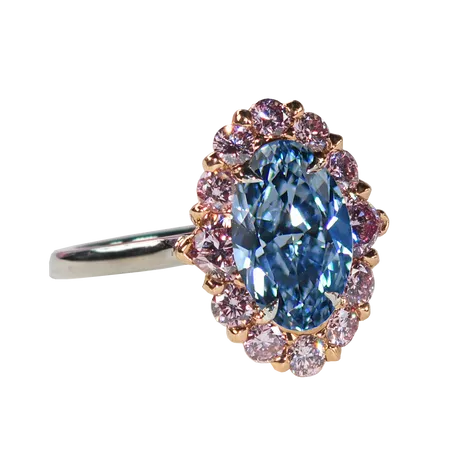 Scott West - 2 carat Fancy Vivid Blue Oval Shape diamond accented by fancy intense pink heart-shaped and round brilliant diamonds set in platinum and 18 karat gold.