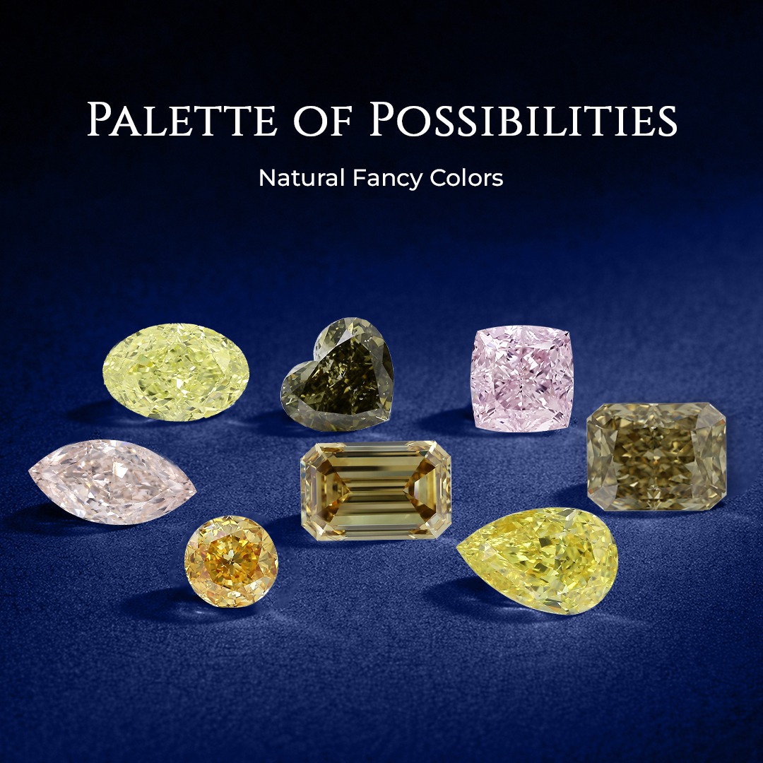 A curated spectrum of natural fancy color diamonds, ranging from vibrant yellows to champagne and rich brown hues. Each stone is expertly cut to maximize color saturation and light performance.