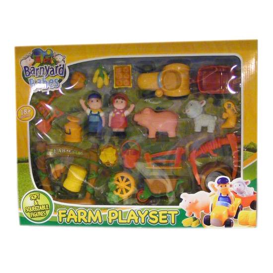 This farm playset is an ideal toy or gift for all young children. The farm playset comes with soft and squeezable figures. The playset also includes farm tools and props such as wheelbarrow, buckets and spades.