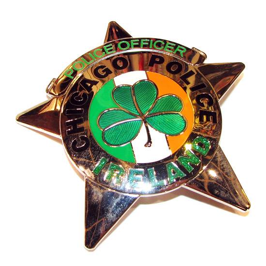 This is an imitation of a police badge. It is made of bronze metal with nickel plating. The nickel plate gives the badge a shiny nature which makes it look extra smart. It features with Irish symbols and character with a "Chicago Police" printed on it.