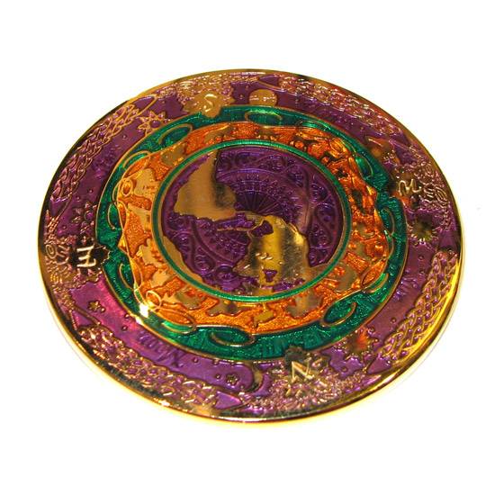 This is an imitation coin. It has an exotic style with its enamed colour, gold and bronze plating. The coins has assorted patterns, showing the north, east, south and west at its four sides and also different animal patterns. The colours and the patterns give people an exotic and mysterious feeling.