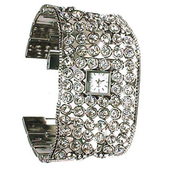 This is a fashion bangle watch decorated with natural-coloured Czech stones. The round stones are mounted on a brass setting surrounding the small square alloy watch case. The watch dial is well-hidden within the glamorous stones, making it a unique jewellery watch for ladies and women.