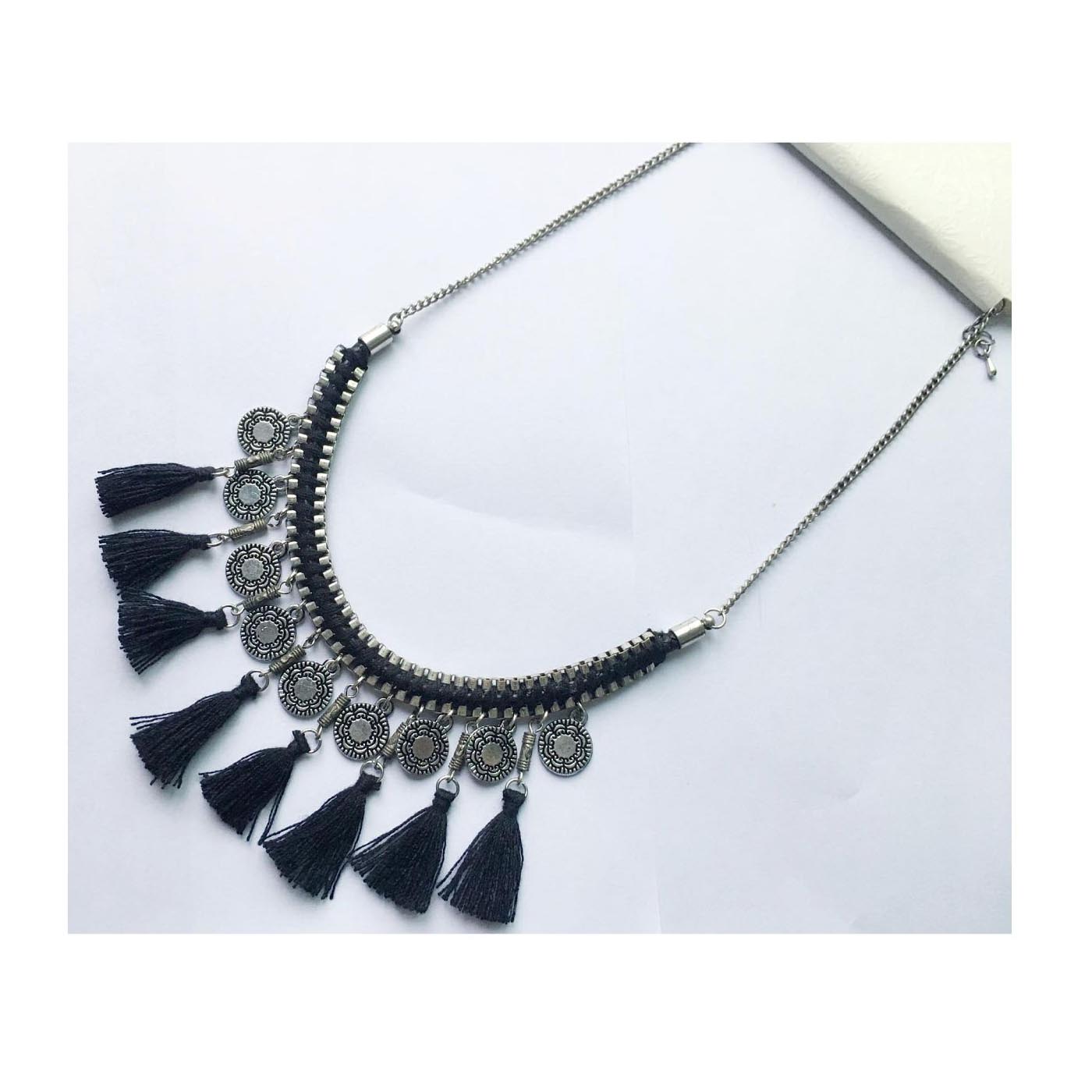 • This is a trendy necklace highlighted by silver plated alloy parts and black tassels.
