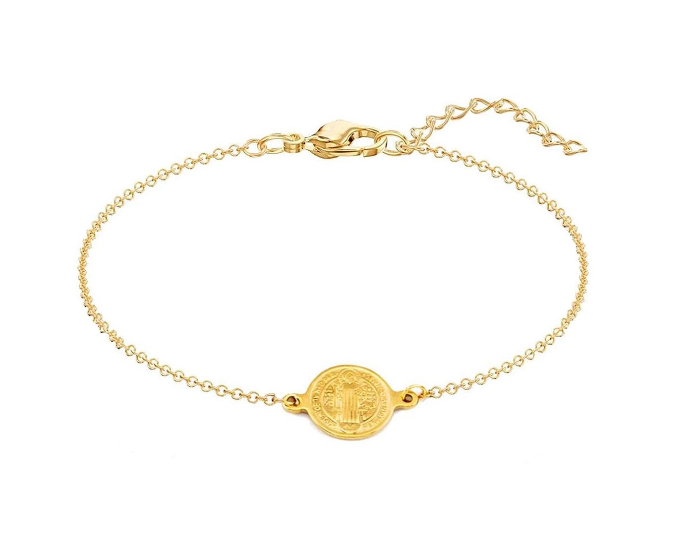 As shown is a high-fashion coin style golden plated bracelet with charm alloy materials.