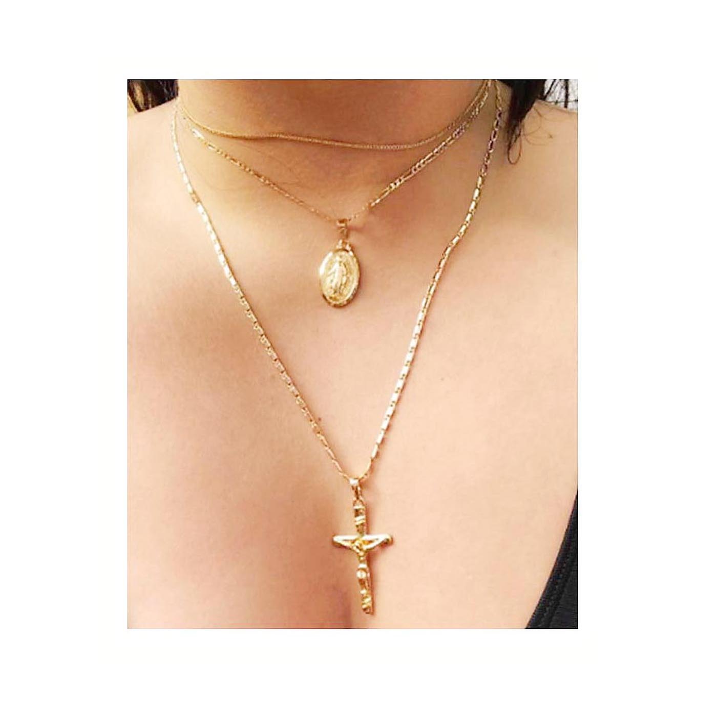 • As shown is an elegant trendy cross pendant necklace with multiple strands each highlighted by metallic accessories.