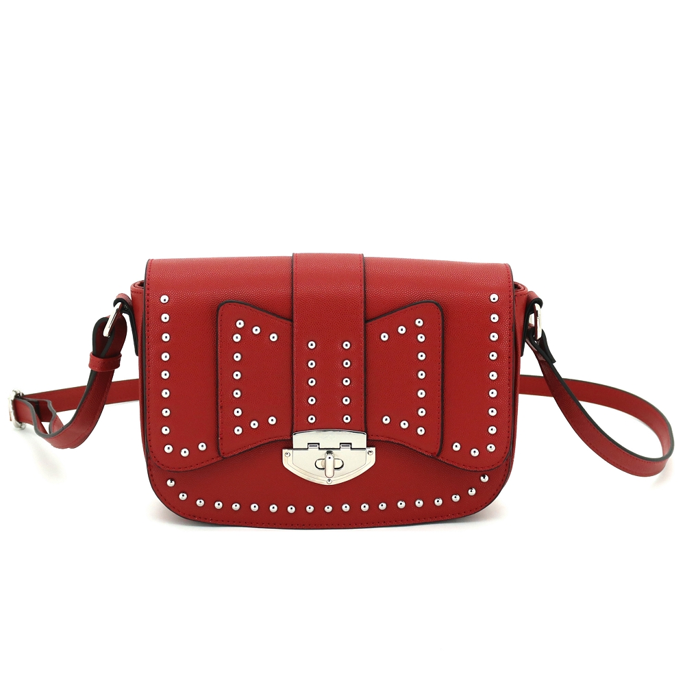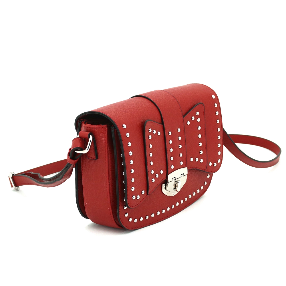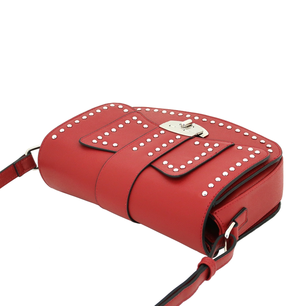 - Synthetic leather with turn lock closure and metal stud design