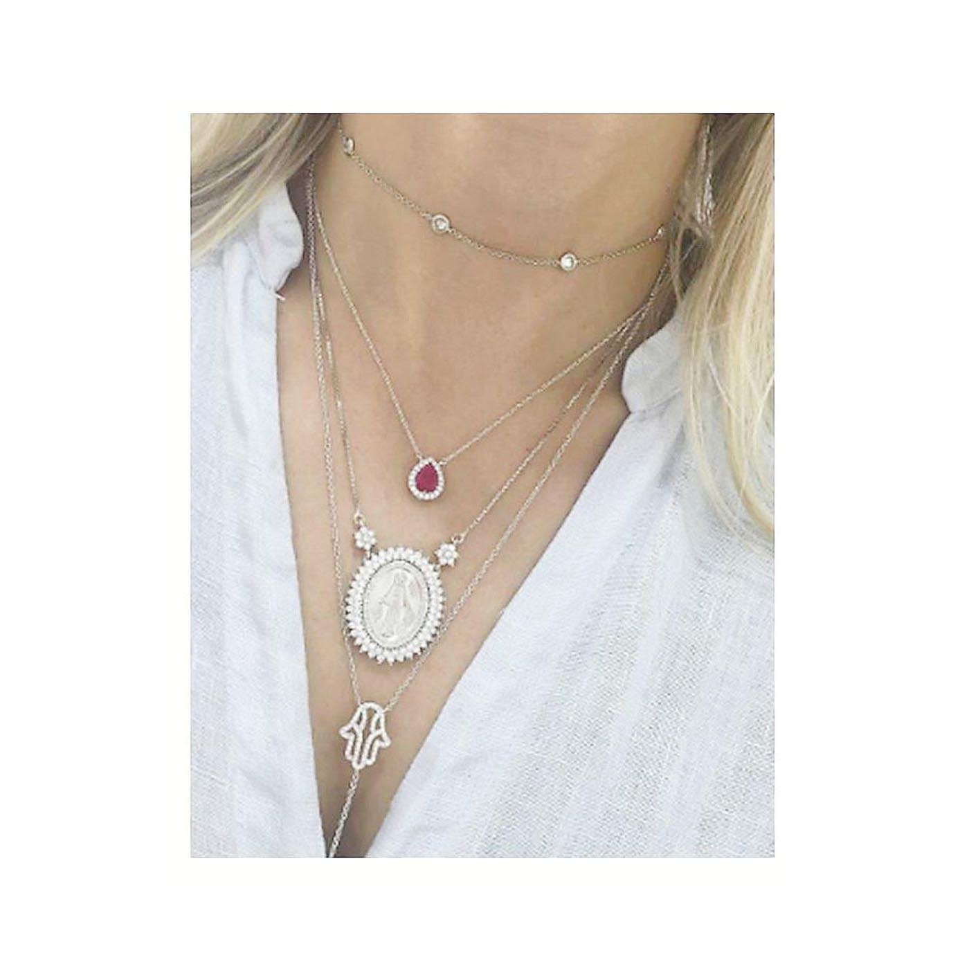 • As shown is an elegant trendy crystals alloy pendant necklace with multiple strands each highlighted by metallic accessories.