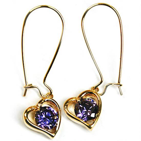 This pair of earrings features two crystal gemstones in heart-shaped metals. The two purple round-shaped gemstones are faceted, so that they sparkle beautifully. The two heart-shaped metals that surround the gemstones are hollow, allowing the gemstones to swing inside the hearts freely.