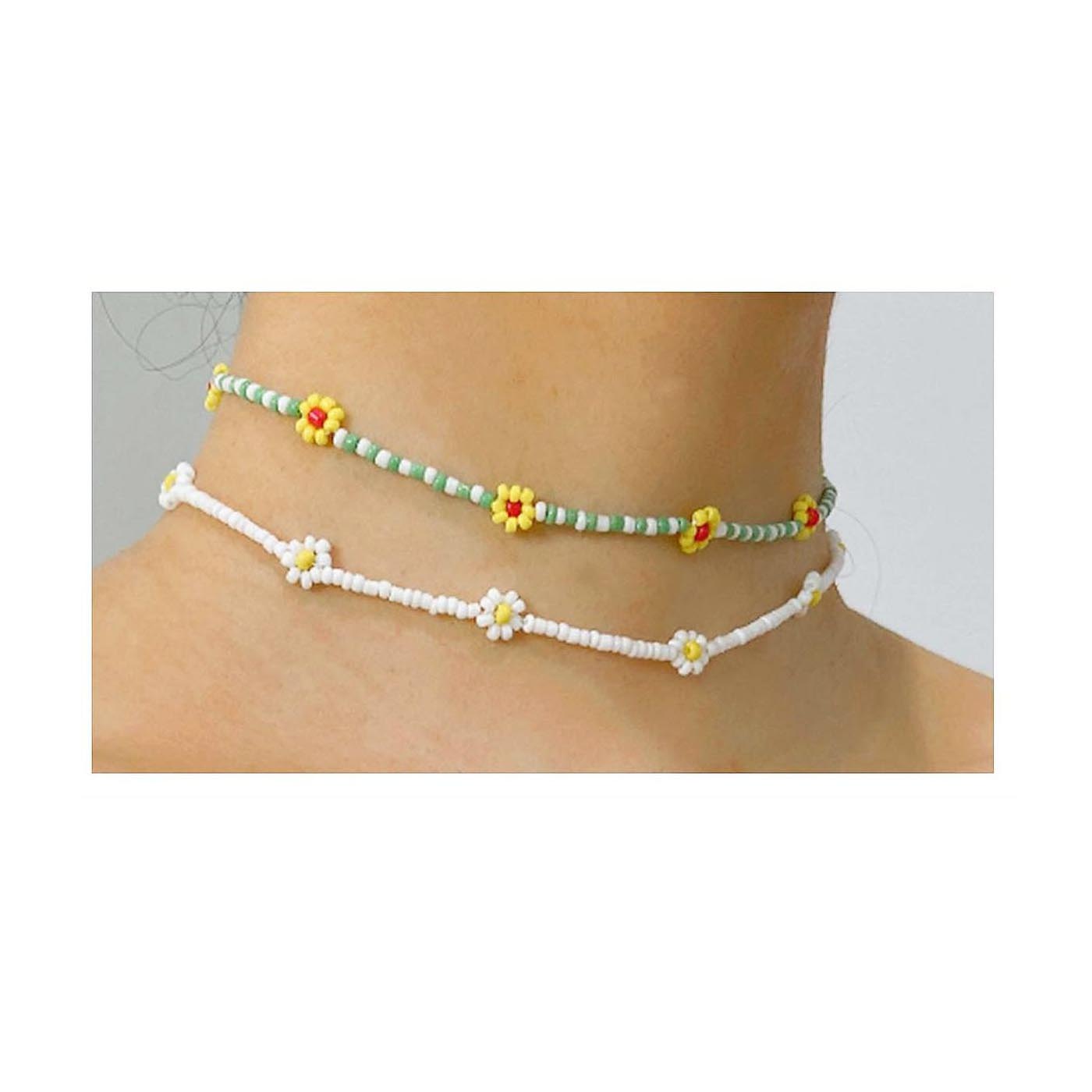 • As shown is an elegant trendy multi strand necklace each highlighted by flower style accessories and plastic beads.
