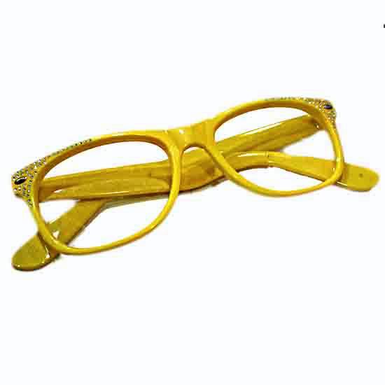 Featured is a pair of glasses made of ABS. The bright yellow color and crystal decoration on the rims boast a trendy flavor. These glasses are an ideal party item and fashion accessory.