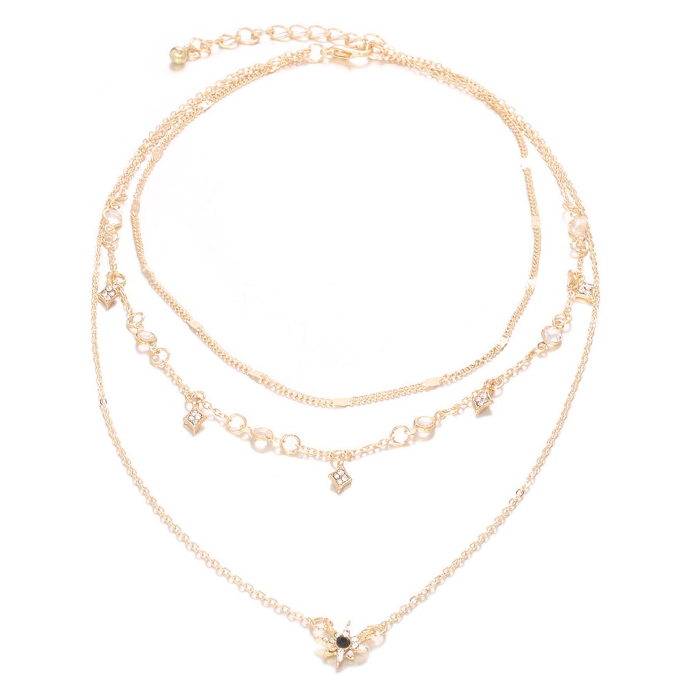 As shown is an elegant trendy necklace with multiple strands each highlighted by golden plated chains.