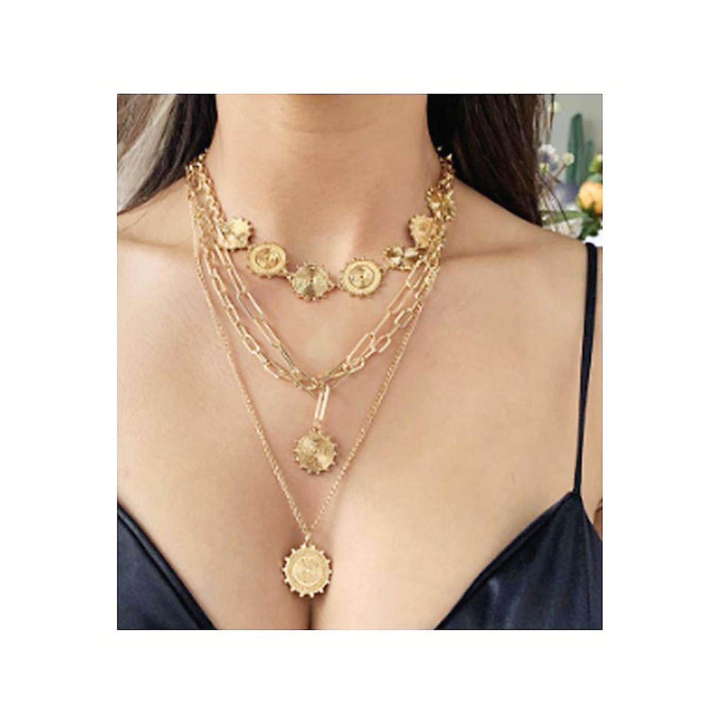• This is a trendy necklace with multiple strands highlighted by gold plated alloy parts and chains.