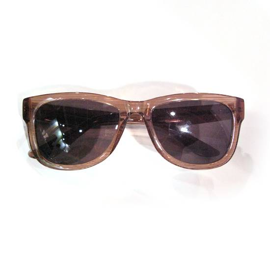 This is a pair of sunglasses with a thick frame made of acetate. It has the colour of transparent chocolate-brown for the frame. The large lenses gives thorough protection for the skin area around the eyes of the wearer.