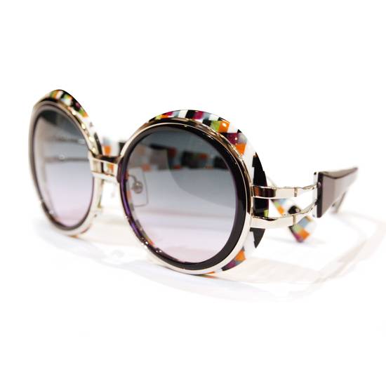 This is a pair of fashion sunglasses made with colourfully decorated mosaic-like acetate spectacle frame. The sunglasses are equipped with dark blue lens.