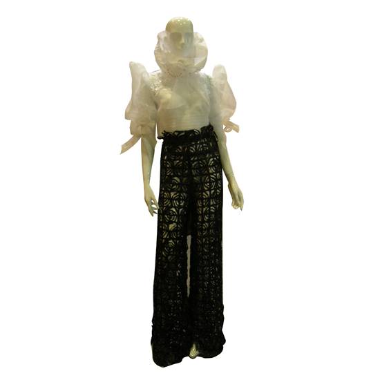 This is a set of high fashion wear. Included are a blouse and a pair of pants. The contrasting colors of a white top and black bottom bring a bold statement.