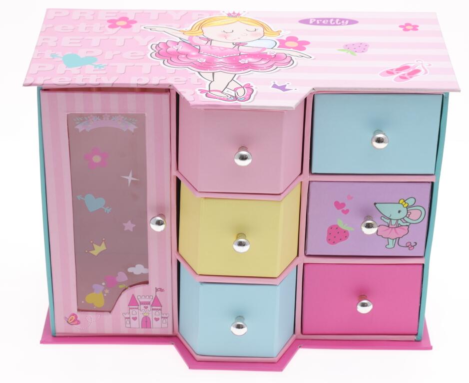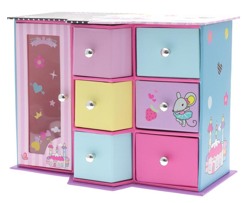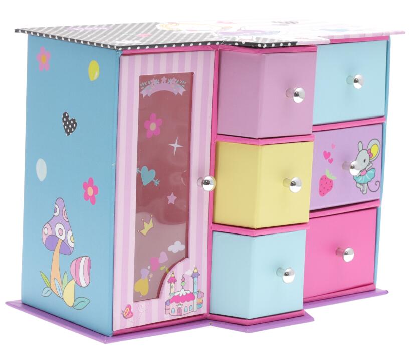 Shaped wardrobe box, size: 19.4X11x16.5CM, three drawers + single door with window, with two transparent plastic hooks.
