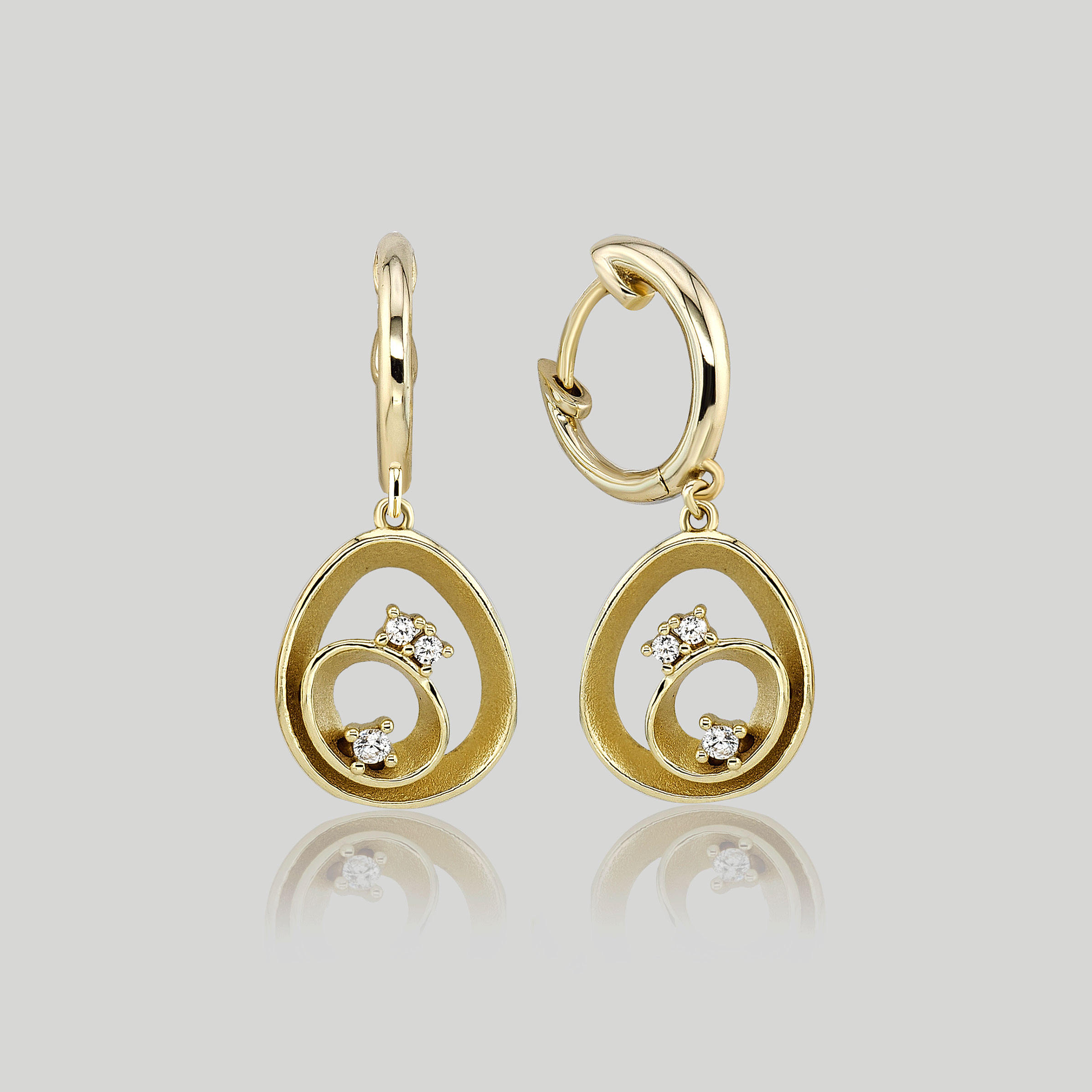 These are elegant 14K flash gold plated drop earrings, featuring a modern, abstract spiral design. Each earring is accented with two sparkling clear pavé stones, adding subtle glamour to their fluid, contemporary shape. They attach via easy-to-wear huggie hoops, making them a chic accessory for both everyday and special occasions.