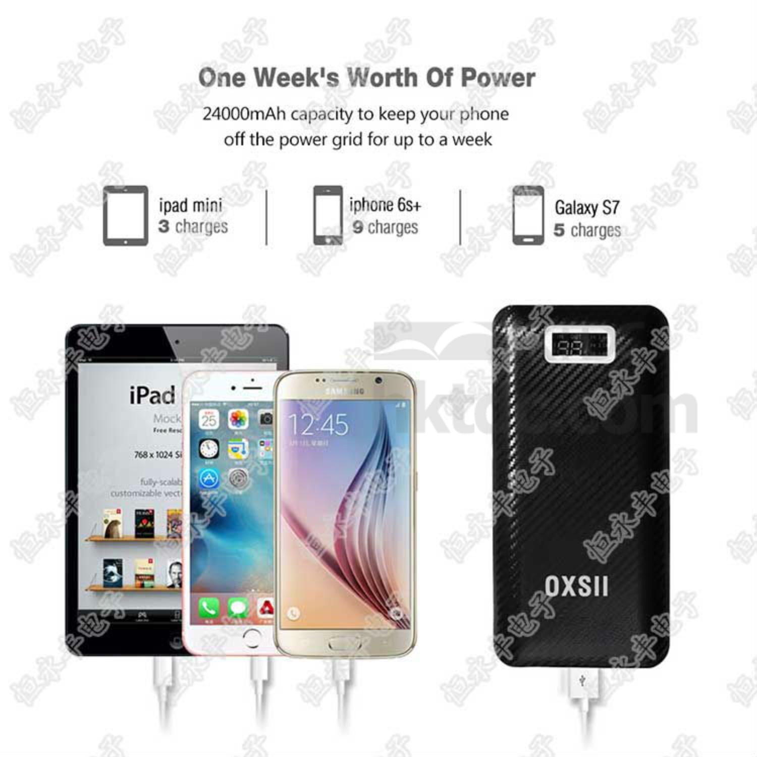 High Capacity: 24000mAh providing almost 7 days of power needed, it can charge the iPhone X for 6 times, iPhone 8 for 7.5 times, Samsung Galaxy S8 for 5.5 times and iPad mini3 for 3 times. Super huge capacity + 2 LED flashlights perfect for business trip, traveling, camping and other outdoor activities.