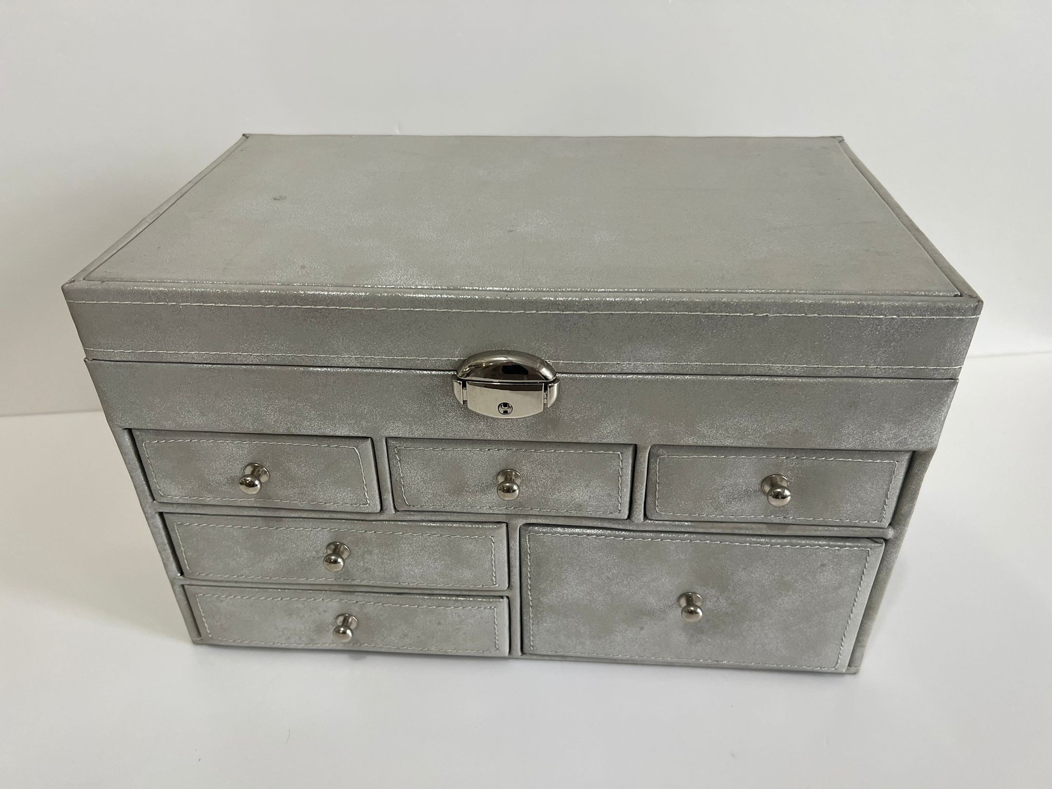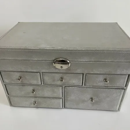 The silver jewelry box is an unconventional proposition for controlling the chaos in your jewelry. The shiny, distressed eco-leather gives the box a great effect, drawing attention. Two handles on the sides allow for easy carrying. The box has 6 drawers and an opening lid with a mirror. Thanks to this, you can sort your jewelry and place it in the appropriate compartments, and after opening it, match it to your makeup or outfit, looking at yourself in the mirror. The lid is locked with a key, so you can hide more valuable trinkets there.