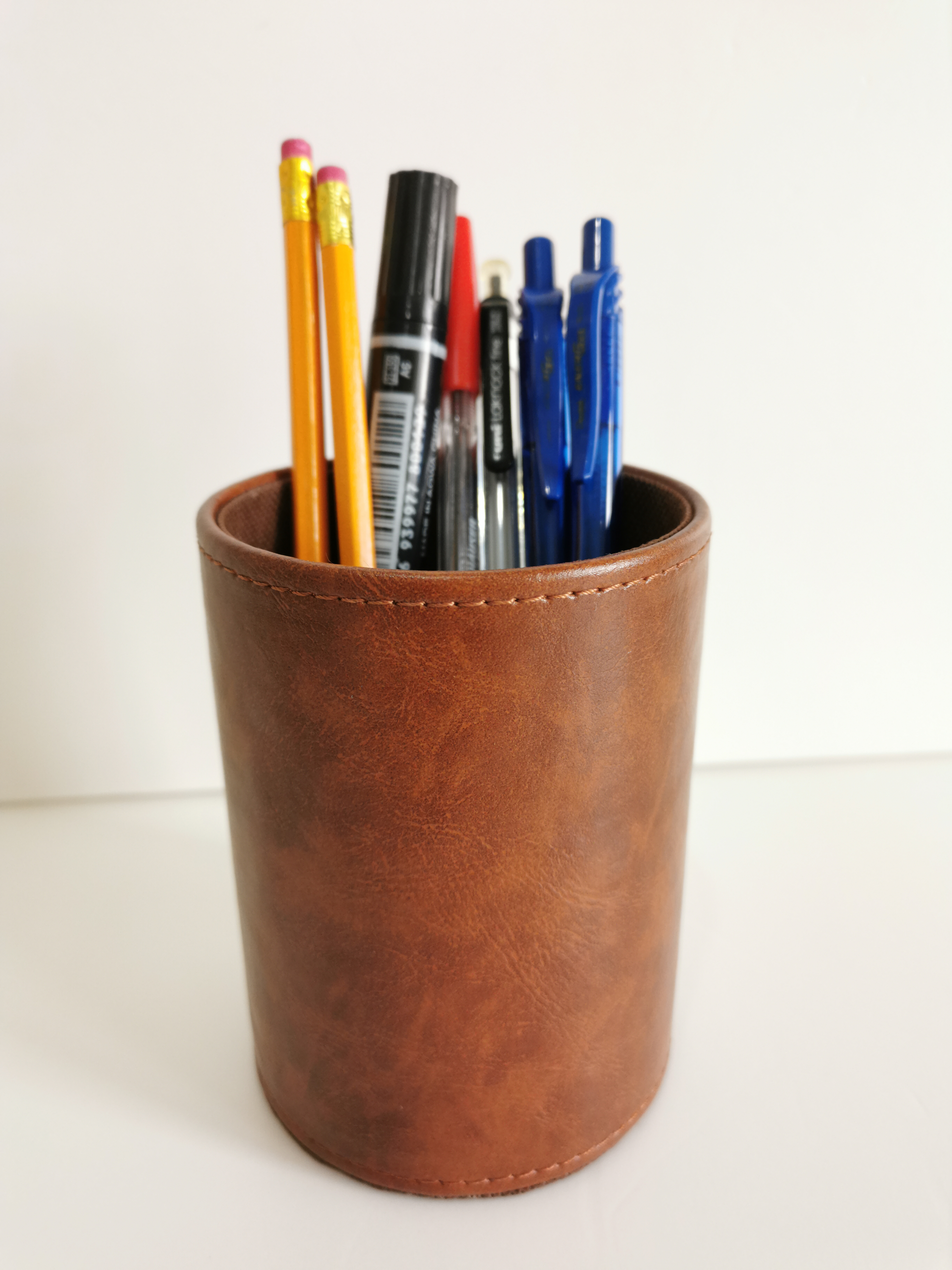 Keep your workspace organised with this pen holder. it features a cylindrical profile with an elegant covering and a contrasting interior. This multipurpose design can be sued to store anything from pens and pencils to makeup brushes.