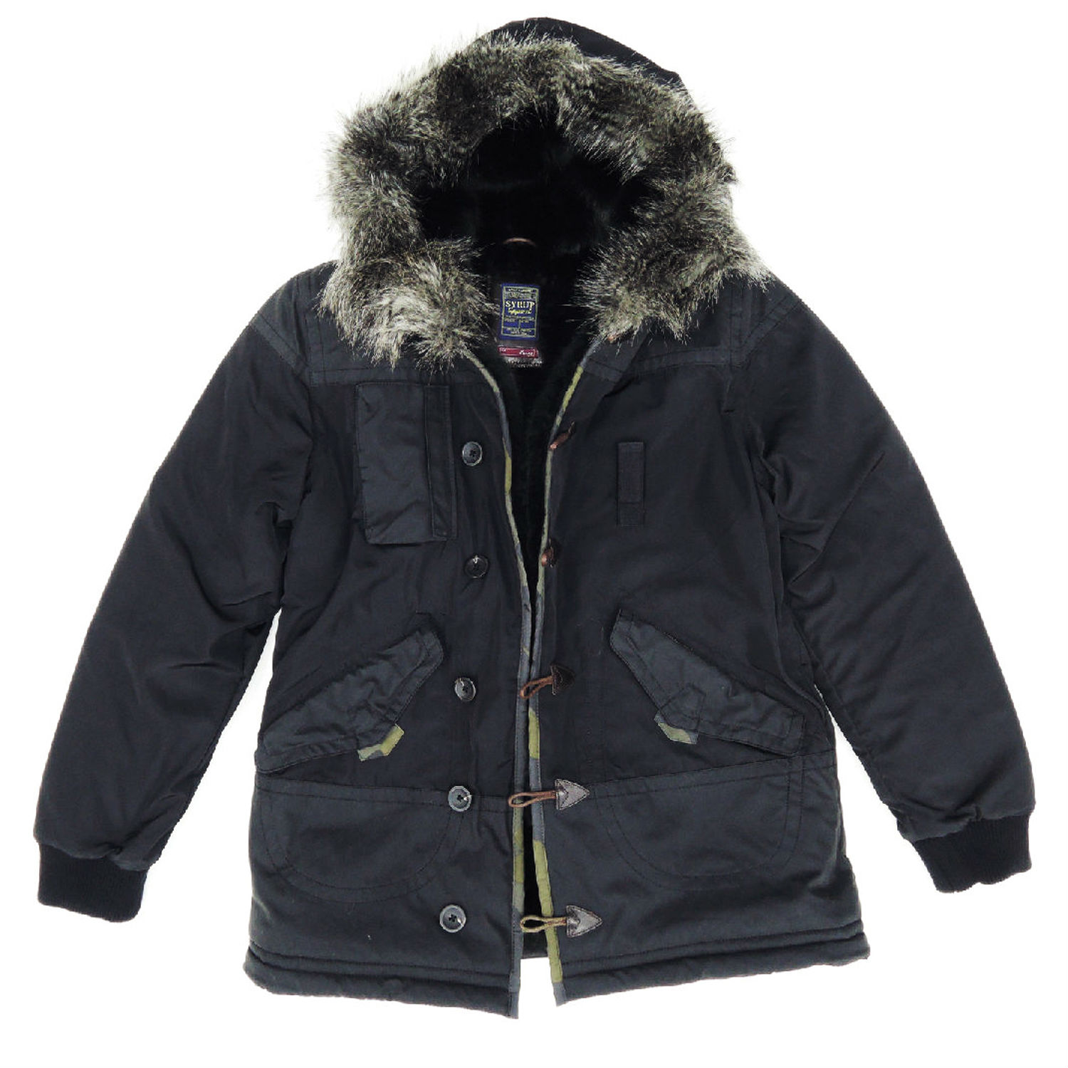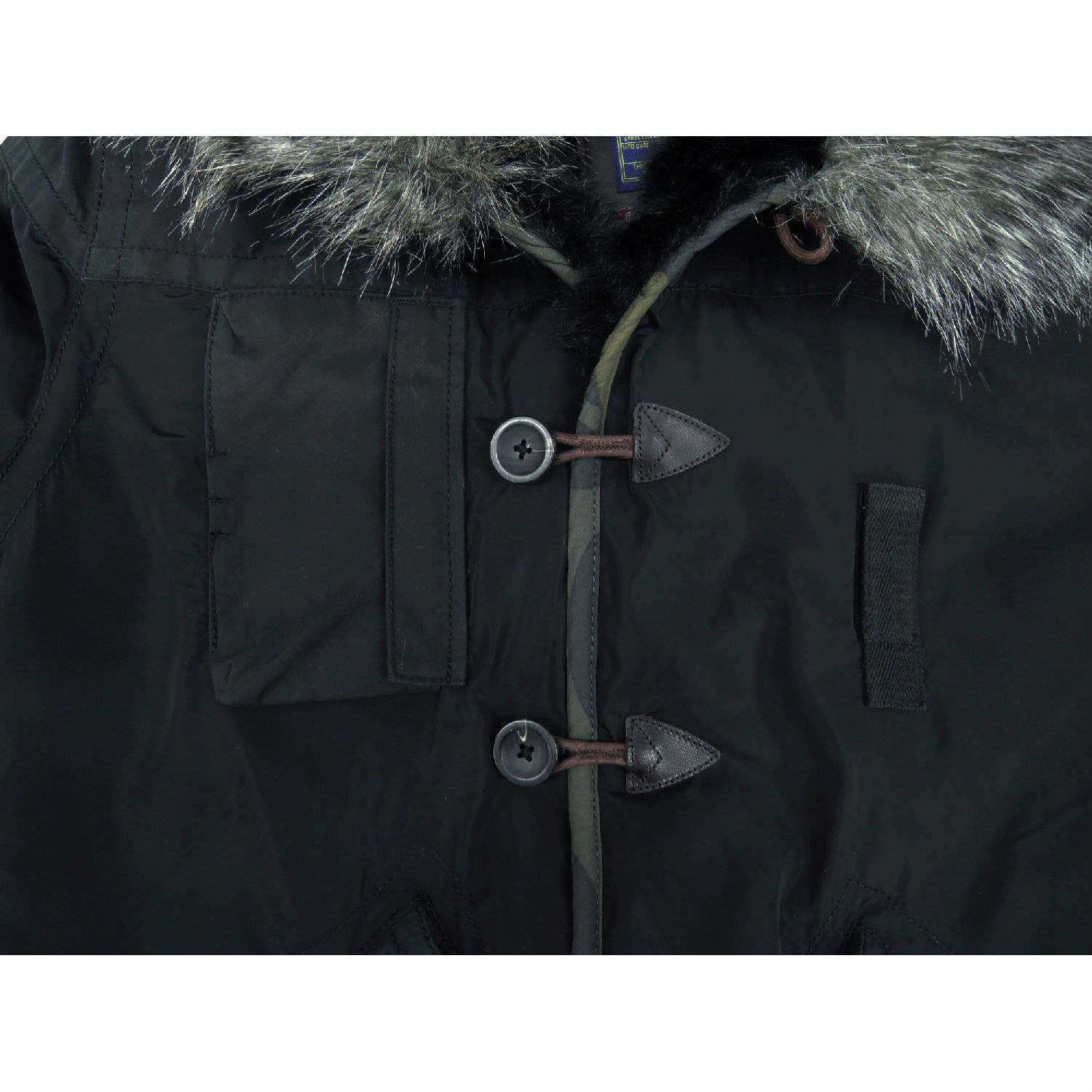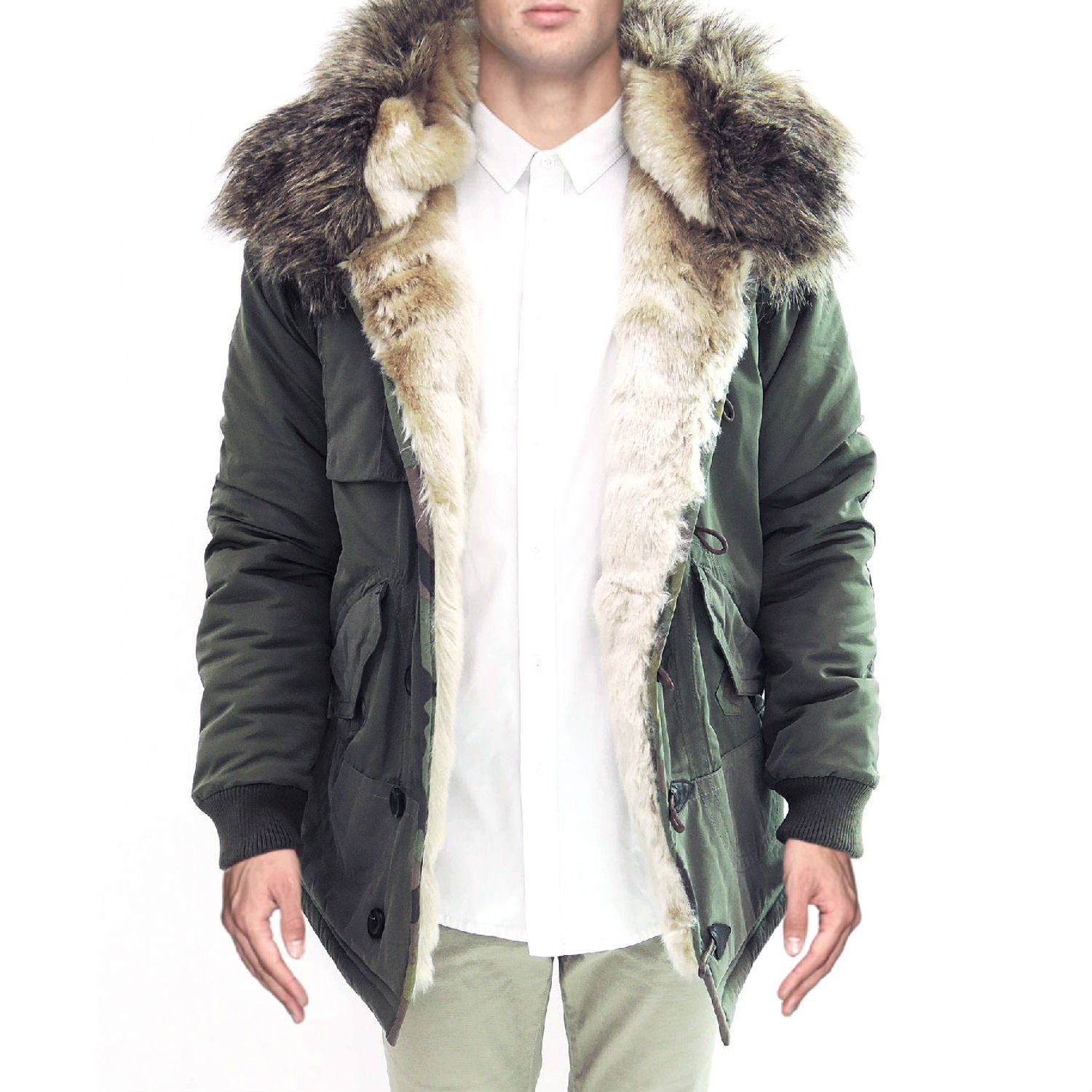 - Large hood with fur trimming.