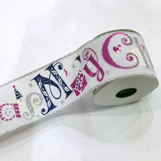 This roll of thick ribbon is from the Christmas-themed assortment with different colors and patterns. It features the joyful "Merry Christmas" prints all over with accents of glitter and various ornaments. It is great for adding a little fun to the Christmas tree or putting them on gifts.