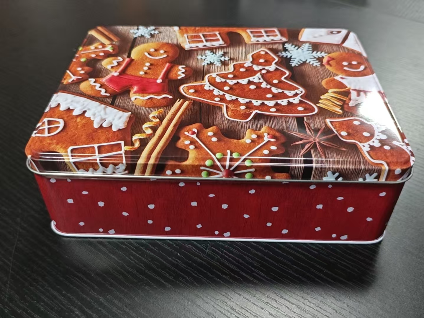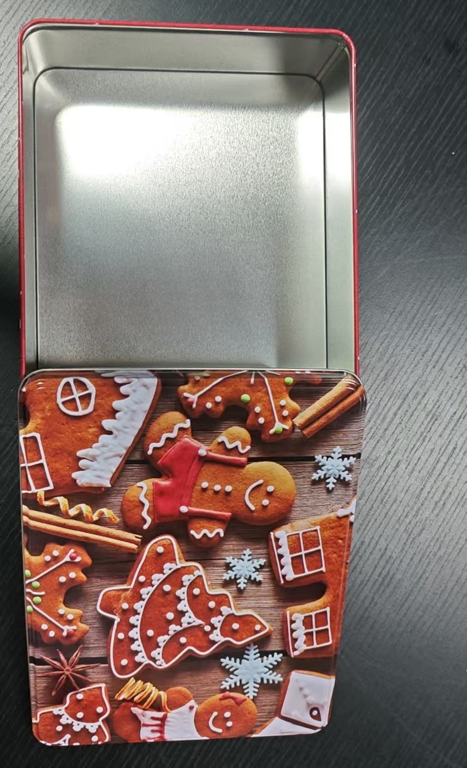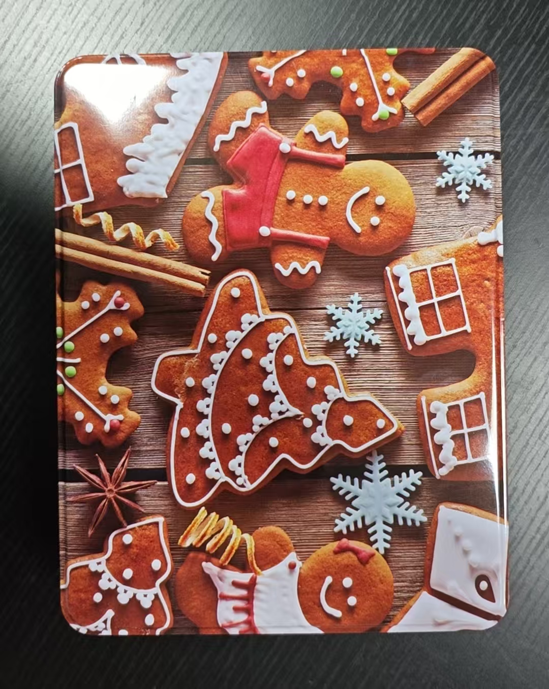At first glance, the tin box captivates with its rich, festive color palette and whimsical illustrative style, immediately transporting viewers to a cozy Christmas kitchen filled with the aroma of freshly baked gingerbread. The lid features a vibrant, photorealistic print of classic gingerbread treats arranged on a rustic wooden surface, creating a sense of warmth and abundance that is quintessentially Christmassy.