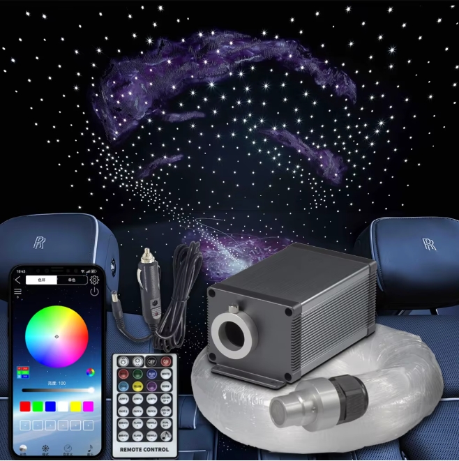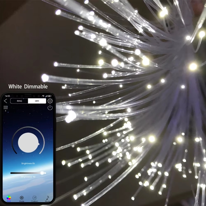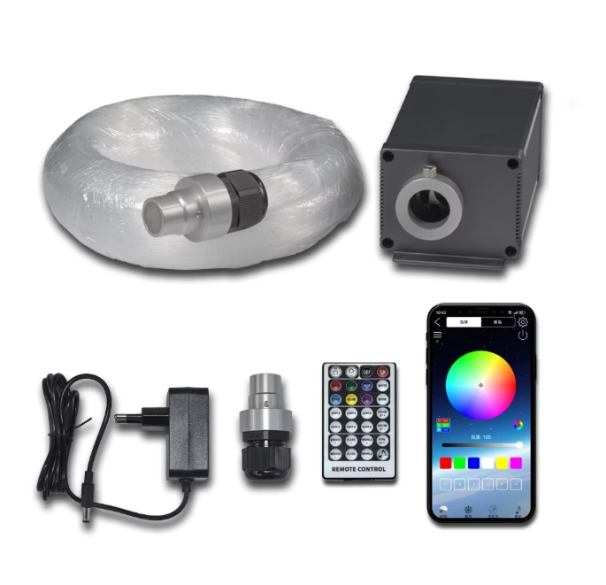 LLE-005 APP is a newly developed LED light engine featuring mobile APP control with RGBW starry effect. The control could be done either on the mobile APP or the 28-key remote control. The fiber bundles along with the light engine consists of 450pcs of 0.75mm bare fiber strands and each strand is 3 meters long. This is a complete fiber lighting kit ready for installation for ceilings of 8-10 meters or headlines.