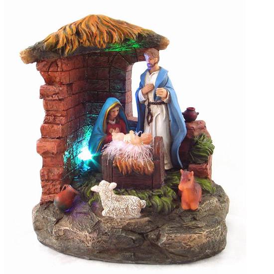 The polyresin Christmas decoration with fiber optic and LED lights demonstrates the holy scene of the birth of Jesus Christ with Mary and Joseph beside. The whole decoration is delicately crafted with details, note the facial expressions of Mary and Joseph, the bricks, the tiny jar and bowl, the miniature sheep and goat. The fiber optic and LED lights glow in the dark and raises the sense of holiness.