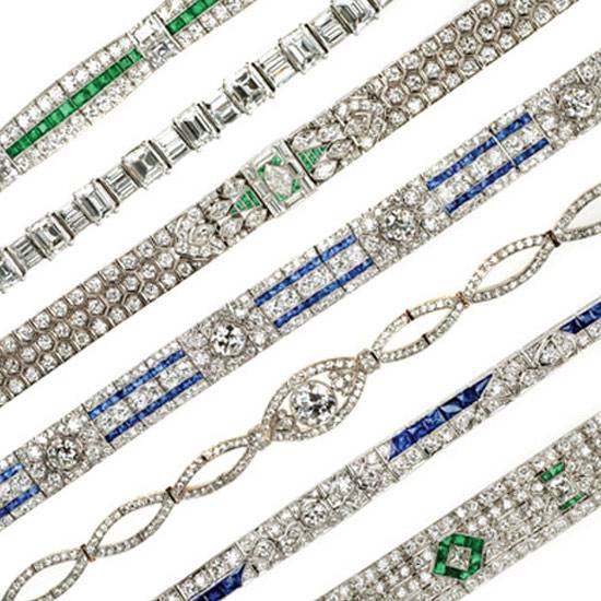 These are bracelets with diamonds, emeralds and sapphires in Fine Art Deco style, which is a popular international design of decprative arts originated in French.