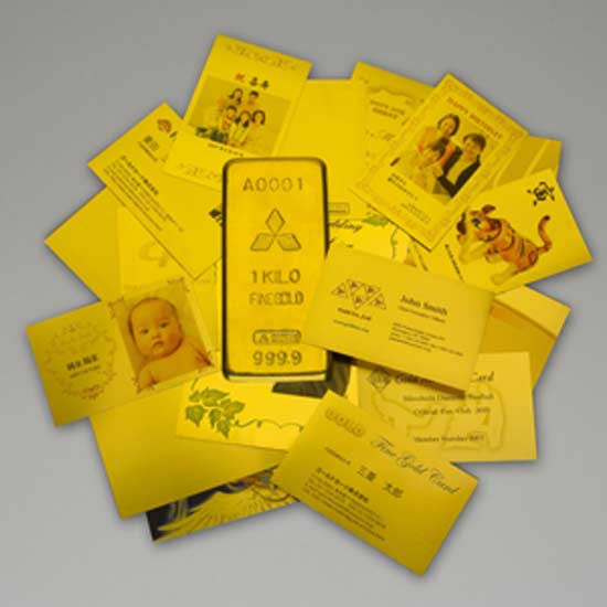 Make a gold name card and display it on your work desk to show your status. The featured cards are made of fine gold with the purity of 99.99%, which is called "four-nines". Gold is processed into a thin plate form by rolling technology and the plates are then covered with protective plastic laminations.