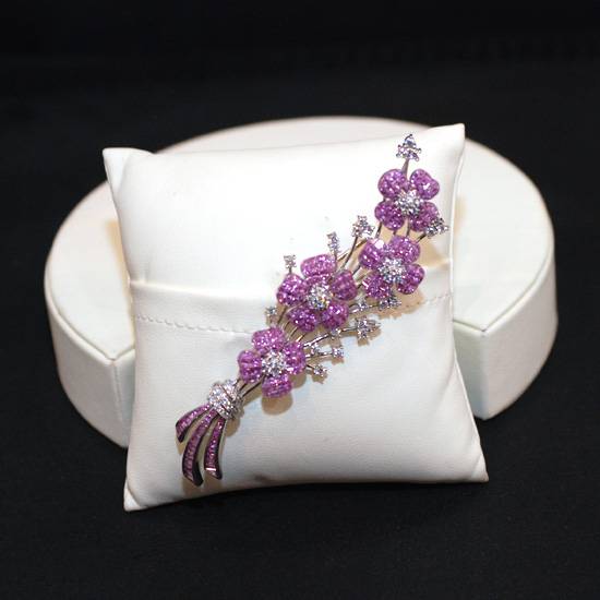The featured jewellery is a 18K white gold brooch with diamond and sapphire setting. Featuring a cluster of four flowers with pink sapphire petals and white diamond buds, the brooch shows an refined and elegant appearance for ladies and women.